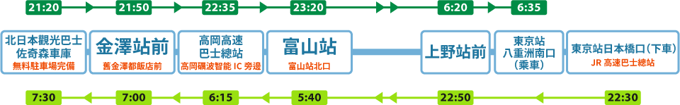 | 高岡高速巴士總站(高岡礪波智能IC旁邊)平台4 | 22:35 | 6:15 |