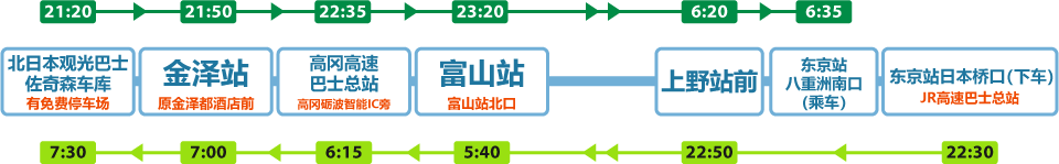 • ※北日本观光巴士仅佐奇森车库至富山站北口区段、东京站至上野站区段无法乘车。