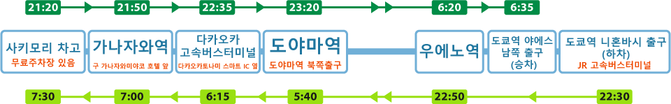 | 다카오카 고속버스터미널(다카오카토나미 스마트 IC 옆) 4번 승강장 | 22:35 | 6:15 |
