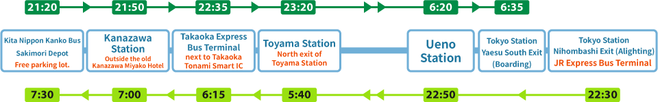 | Takaoka Express Bus Terminal (next to Takaoka Tonami Smart IC) Platform 4 | 22:35 | 6:15 |